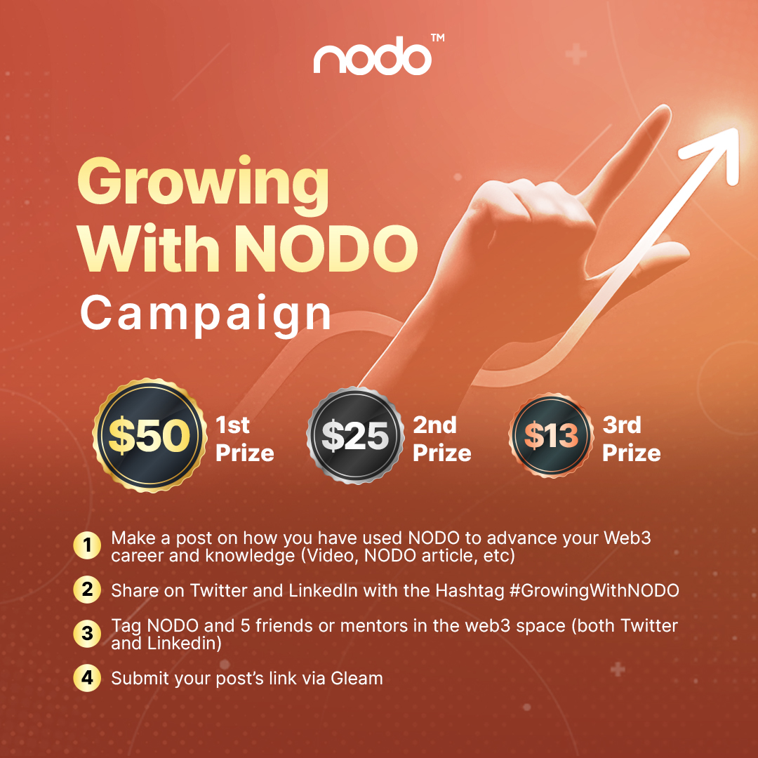 Join us in the exhilarating #GrowingWithNODO campaign and share your remarkable journey of growth! Share how NODO has ignited your passion for Web3, and you could be one of our lucky winners, walking away with fantastic prizes!